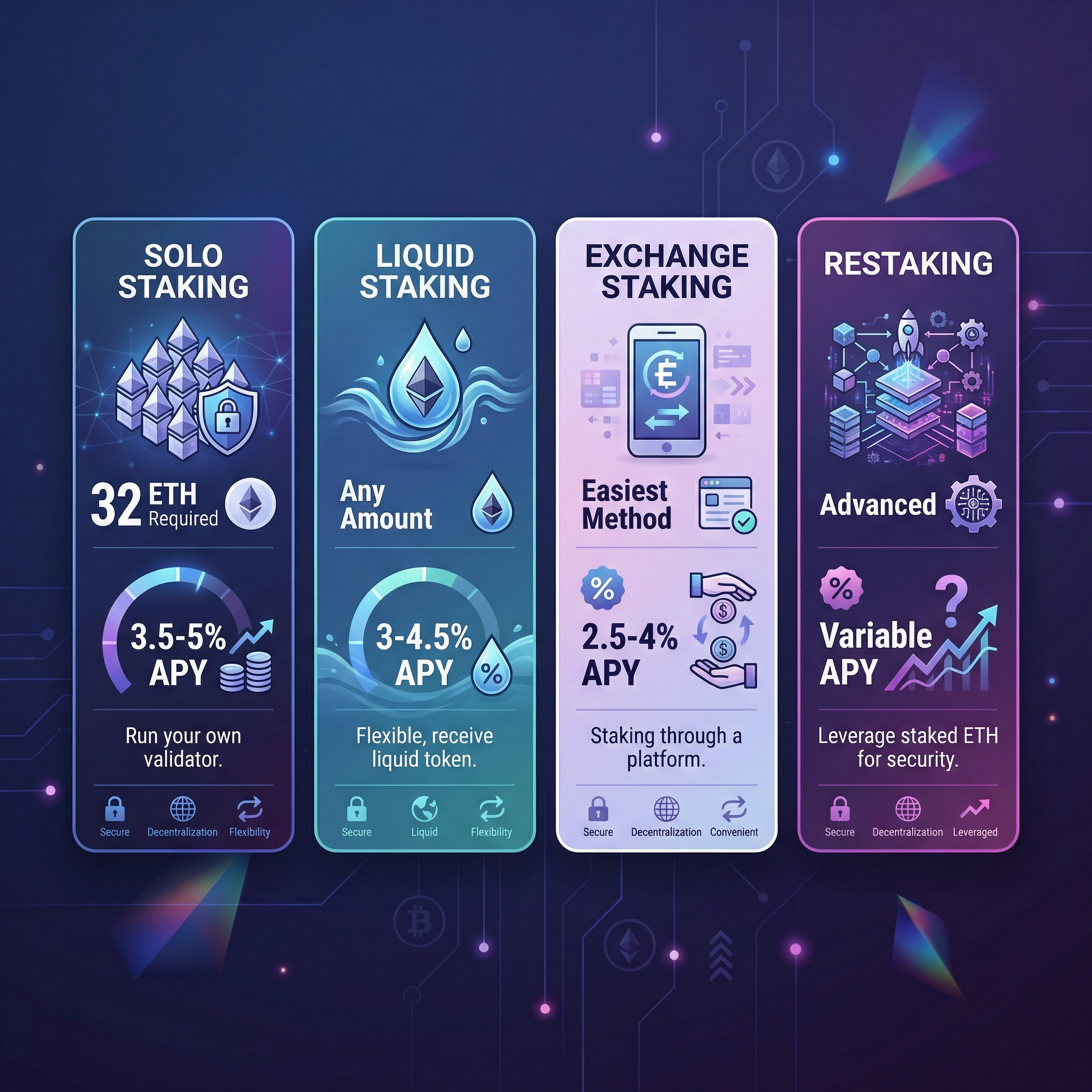 - Solo staking offers the highest rewards but requires 32 ETH and technical expertise.